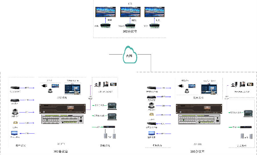 (2)项目包含:本项目共建设2间会议室,使用2台视通科技(AVSYS)UT4录播主机、5台DSR分布式设备,实现统一控制管理,音视频调度等应用。